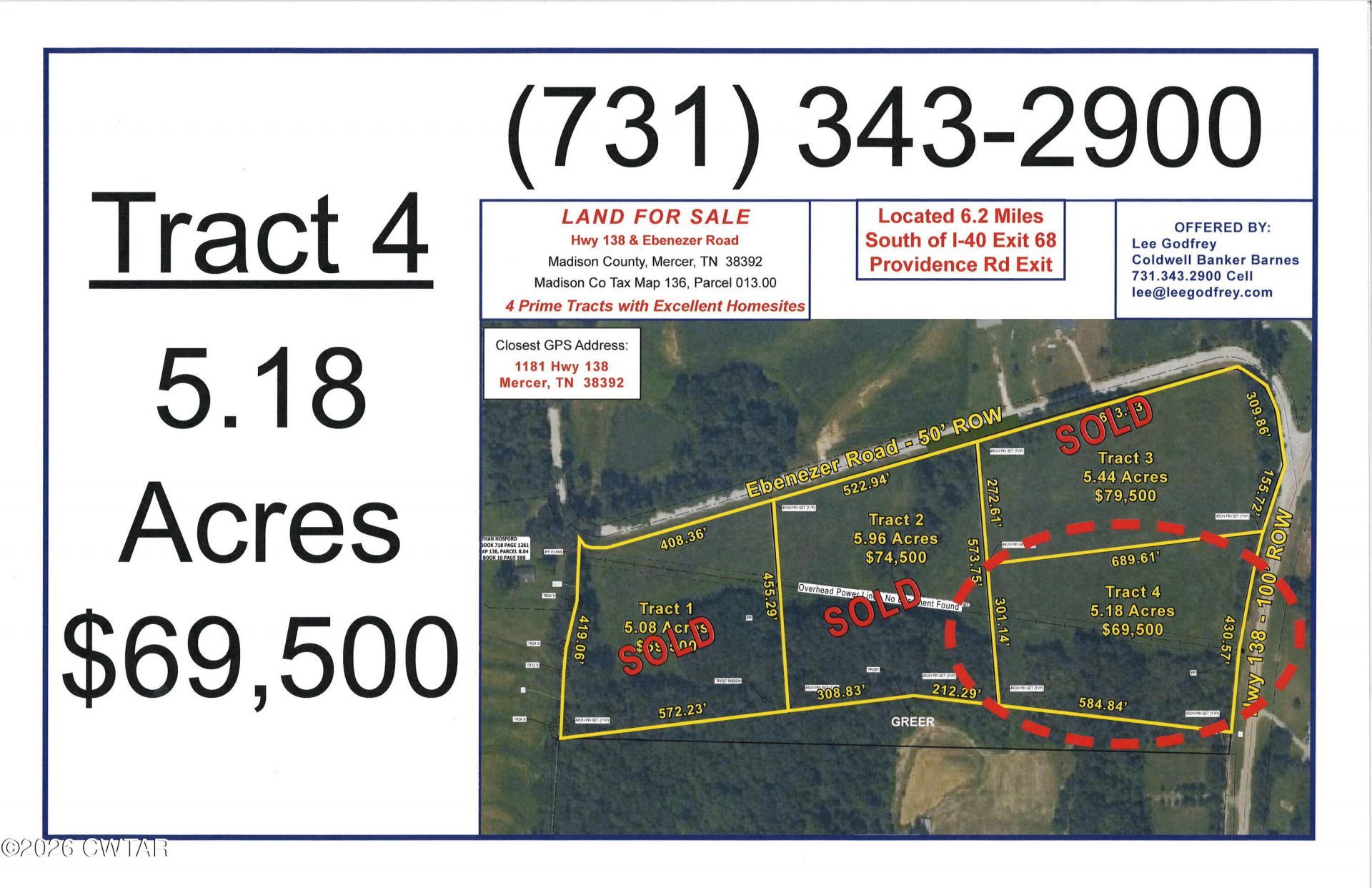 Gently rolling 5.18 Acre tract of land with 430 Ft of frontage on Hwy 138. Located in southwest Madison Co, TN only 6.2 miles south of I-40 @ Exit 68 (Providence Rd). Tract is open with some woods & great building sites. Well and septic are required when building, No Mobile Homes, Stick built house required,. ALREADY APPROVED FOR SEPTIC SYSTEM. Surveyed and ready for you to start your American Dream. ***GPS at intersection of Hwy 138 & Ebenezer Rd: 1181 Hwy 138, Mercer, TN 38392