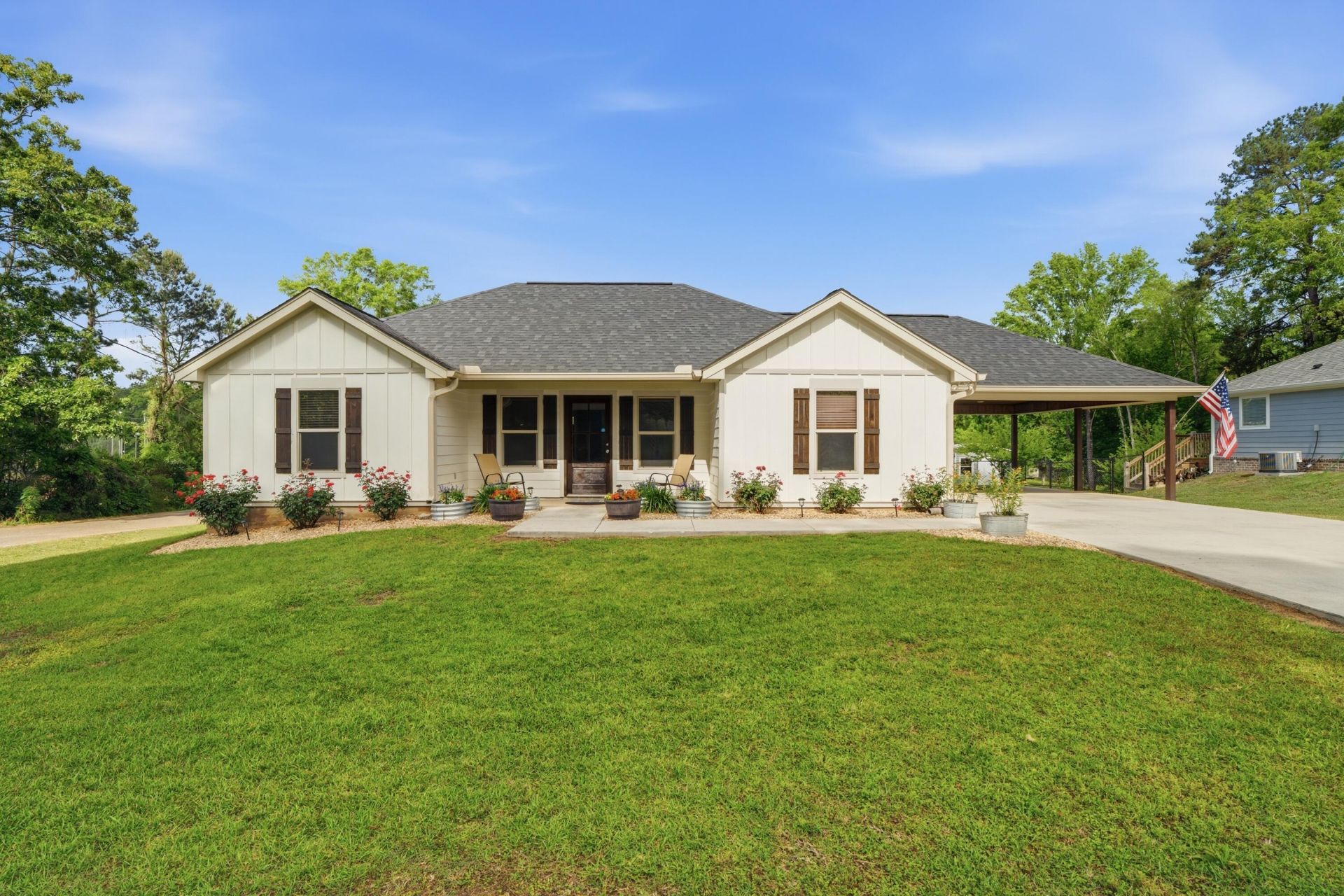 Welcome to this beautifully maintained 3-bedroom, 2-bath home built in 2020, offering modern comfort with a charming farmhouse feel. From the moment you arrive, you'll notice the inviting curb appeal that sets the tone for what's inside.Step into a bright and welcoming interior featuring all-new paint, wood-look vinyl flooring throughout, new ceiling fans, and updated doors. The thoughtfully designed split floor plan provides both privacy and functionality. The spacious living area flows seamlessly into the kitchen and dining space, offering an open-concept feel with just the right hint of separation. The dining area is a standout featuring a wall of beautiful cabinetry perfect for extra storage or creating the ideal buffet setup for gatherings. The kitchen is both stylish and functional, showcasing white upper cabinets paired with darker lower cabinets for a modern look, along with granite countertops, stainless steel appliances, and a stainless steel double sink. Granite counters continue in the bathrooms for a cohesive finish throughout the home. The laundry room is equipped with convenient overhead built-ins and a drying hang bar, adding to the home's practical features.Enjoy the best of outdoor living with a spacious back deck overlooking a nice above-ground pool, perfect for relaxing or entertaining. The home is situated in a well-established, convenient neighborhood within an award-winning school district. This property is ideal for those seeking quality education and a strong sense of community. Additional features include a versatile building in the side yard. This building can remain with the property for an additional $10,000 added to the sales price, or the sellers can remove it. Sellers are also offering a $3,000 landscaping allowance, providing a great opportunity to personalize the outdoor space.Don't miss your chance to own this move-in-ready home with modern finishes and timeless appeal!