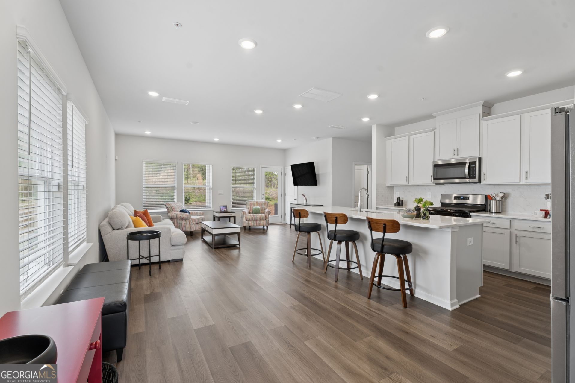 Enjoy exceptionally low HOA fees and like-new construction in this 2025 built end-unit townhome, located just a short walking distance to Smyrna's growing Riverview Landing and the Chattahoochee River. This 3-bedroom, 2.5-bath home is one of the community's largest townhome three bed floorplans and features a spacious, open-concept main level with tall ceilings, rich dark flooring, and an abundance of natural light throughout. Designed with entertaining in mind, the eat-in kitchen offers shaker-style cabinetry, quartz countertops, stainless steel appliances, pantry, and an oversized island that blends seamlessly in with the large living area. Upstairs, the oversized primary suite provides larger than average space, walk-in closet, double vanity, and a large walk-in shower. Two additional bedrooms share an en suite full bath, while the versatile loft offers the perfect space for a home office, media room, or play area. The private rear patio backs up to protected greenspace that cannot be developed; creating a peaceful setting to relax, grill, or entertain. As an end unit, the home also enjoys additional side yard space. The extended driveway allows for plentiful parking, and guest parking is conveniently located just steps away. The finished garage with custom flooring adds flexibility for a home gym, workshop, or additional storage. Located in the recently completed Terrace at Riverview Landing, residents enjoy VERY low HOA dues and access to the pool, clubhouse, and dog park - all in an unbeatable location! Walk just down the block to Riverview Landing for coffee at Chattahoochee Coffee Co., beer at Reformation Brewery, and BBQ at Owens & Co.! Enjoy the riverfront trails and upcoming paved pedestrian / bike path there along Riverview Park or head over to close by Oakdale Park, West Smyrna Village, Vinings, Smyrna Market Village, West Midtown, and The Battery. Easy access to I-285 and I-75 makes commuting a breeze!