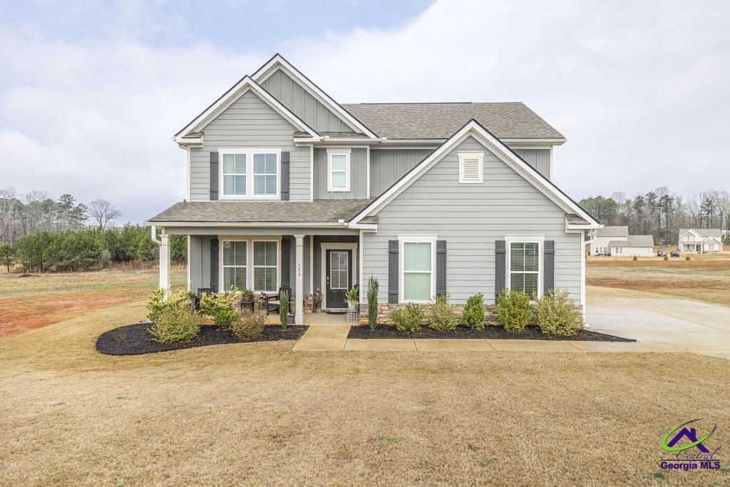 Welcome to this beautifully crafted modern farmhouse-style home built in 2023 and situated on a spacious 1-acre lot in the desirable Bolingbroke Manor area of North Macon. Offering approximately 2,505 square feet of thoughtfully designed living space, this two-story residence features four bedrooms and three full bathrooms. The exterior showcases timeless curb appeal with a stone water table and side-entry two-car garage. Inside, you'll find a formal dining room and a dedicated study, perfect for entertaining or working from home. The open-concept kitchen includes abundant cabinetry, granite countertops, subway tile backsplash, pantry space, and a bright breakfast area overlooking the inviting family room. Luxury vinyl plank flooring enhances the main living areas, while the spacious primary suite offers a double vanity, separate soaking tub and shower, and a large walk-in closet. Additional highlights include a convenient mud bench at the garage entry and a covered rear porch ideal for relaxing or entertaining outdoors. This home combines modern finishes, functional design, and peaceful surroundings while remaining conveniently located to North Macon amenities and major roadways. Take advantage of a great homeownership opportunity! Qualified buyers may receive up to $3,000 in lender credit toward closing costs when using preferred lender Letty Felcan with New American Funding.