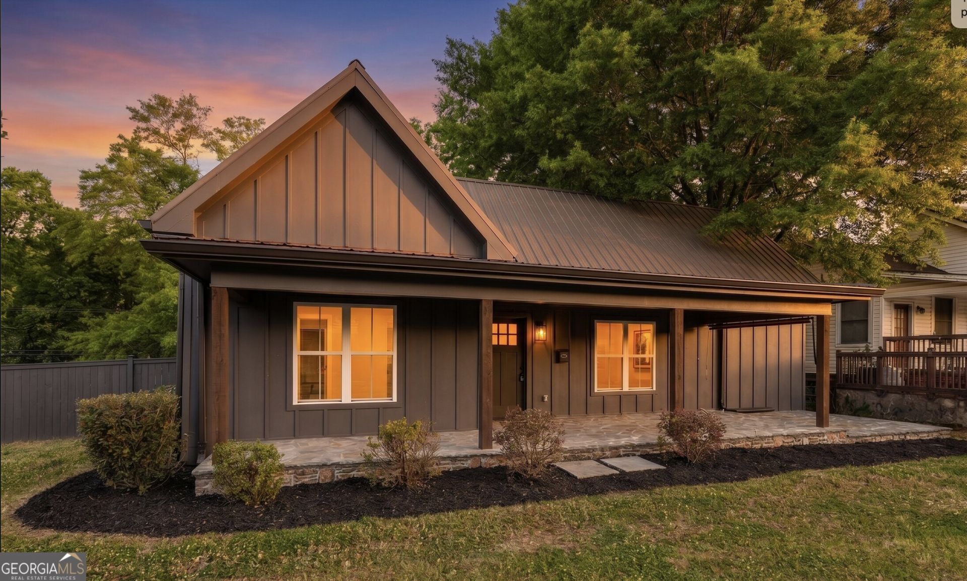 Fully renovated ranch in the heart of Bremen, blending timeless character with modern design. This charming home features a board and batten exterior, metal roof, and a beautiful flagstone covered front porch that welcomes you into a bright, open-concept great room. Inside, the living area flows seamlessly into the eat-in kitchen, complete with a shiplap island, breakfast bar, subway tile backsplash, stainless steel appliances, and a dedicated dining area, perfect for everyday living and entertaining. The primary suite offers a stylish retreat with a sliding barn door leading into a spa-like bath featuring a fully tiled walk-in shower, custom wood vanity, and striking tile flooring, along with a spacious walk-in closet. Two secondary bedrooms and an additional full bathroom provide flexibility for family or guests. Step outside to a spacious deck overlooking the fenced backyard, with a rear driveway and parking pad for added convenience. With no HOA, you have the freedom to design an outdoor space that fits your lifestyle. Ideally located within walking distance to downtown Bremen and The Hub allowing you to enjoy easy access to shopping, dining, healthcare, and recreational amenities. All while enjoying the charm of a thoughtfully updated home.