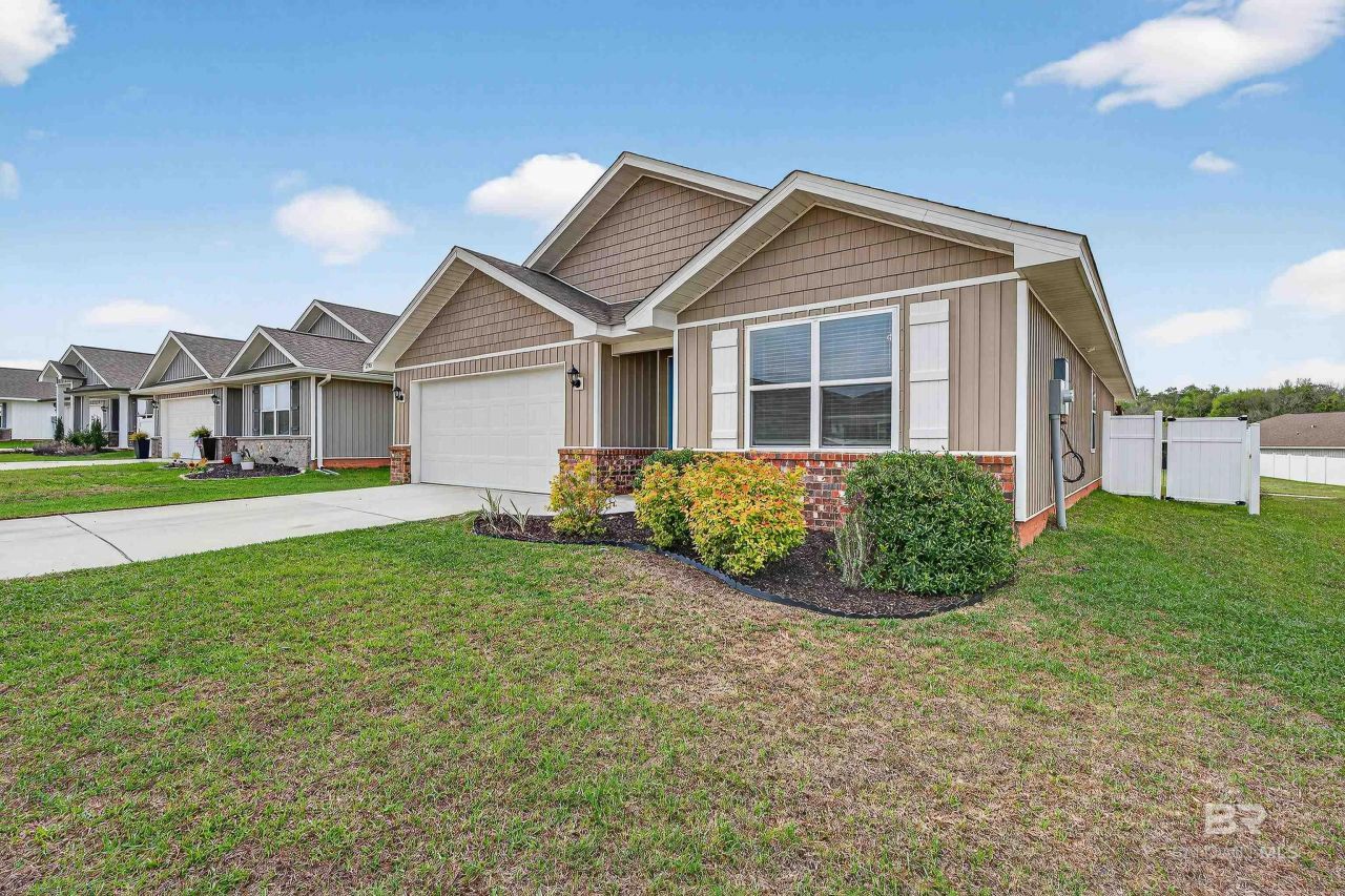Welcome home to Jubilee Farms! This popular Cali floorplan offers an open-concept living designed for both comfort and functionality. The kitchen features granite countertops, stainless steel appliances, and a spacious pantry. Luxury vinyl flooring runs throughout the entire home, providing a clean, modern look with no carpet. This home feels larger than its square footage suggests with a split-bedroom layout that offers added privacy. The spacious primary suite features a garden tub, dual sinks, a separate shower, and a large walk-in closet. Three additional bedrooms and a full bathroom are located toward the front of the home, providing flexibility for family, guests, or a home office. Step outside to a fully fenced backyard with a covered patio plus an extended uncovered patio. Built in 2021 and Gold Fortified, this home offers increased energy efficiency and potential insurance savings. Residents of Jubilee Farms enjoy resort-style amenities including a lagoon-style zero-entry pool with a 20-ft waterslide, second quiet pool, splash pad, fitness center, yoga room, playground, parks, fishing ponds, fire pit, grilling areas, and a clubhouse. Conveniently located near schools, shopping, I-10, Fairhope, and the beaches. This home is expected to be zoned for the brand-new Jubilee Elementary. Buyer to verify all information during due diligence.