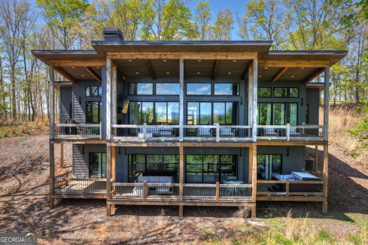 Positioned to capture sweeping year-round mountain views and rolling pasture, 315 Blue Berry Ridge is a striking contemporary chalet that seamlessly blends modern design with the natural beauty of North Georgia. Walls of glass and expansive sliding doors frame the landscape, filling the home with light and opening to a sprawling outdoor living deck anchored by a stone fireplace-designed for effortless indoor-outdoor entertaining. The main level offers a refined open-concept layout with a spacious living room, dining area, and a gourmet kitchen outfitted with stainless steel appliances, custom cabinetry, and a generous pantry. A large laundry and mud room provides functional ease with direct access to the detached, finished two-car garage. The primary suite on this level is a private retreat, complete with a spa-inspired en-suite featuring dual vanities, a walk-in tile shower, and a soaking tub. The terrace level is built for gathering and relaxation, offering a substantial den, game area, and full wet bar, along with two additional luxury bedroom suites for guests. Step outside to the walk-out patio where a hot tub and outdoor game area invite you to unwind beneath the mountain skyline. Offered fully furnished, this property is a proven high-performing short-term rental and an exceptional opportunity as a full-time residence, second home, or investment. Ideally located just minutes from Downtown Blue Ridge, Lake Blue Ridge, and endless hiking and biking trails, this is elevated mountain living at its finest.