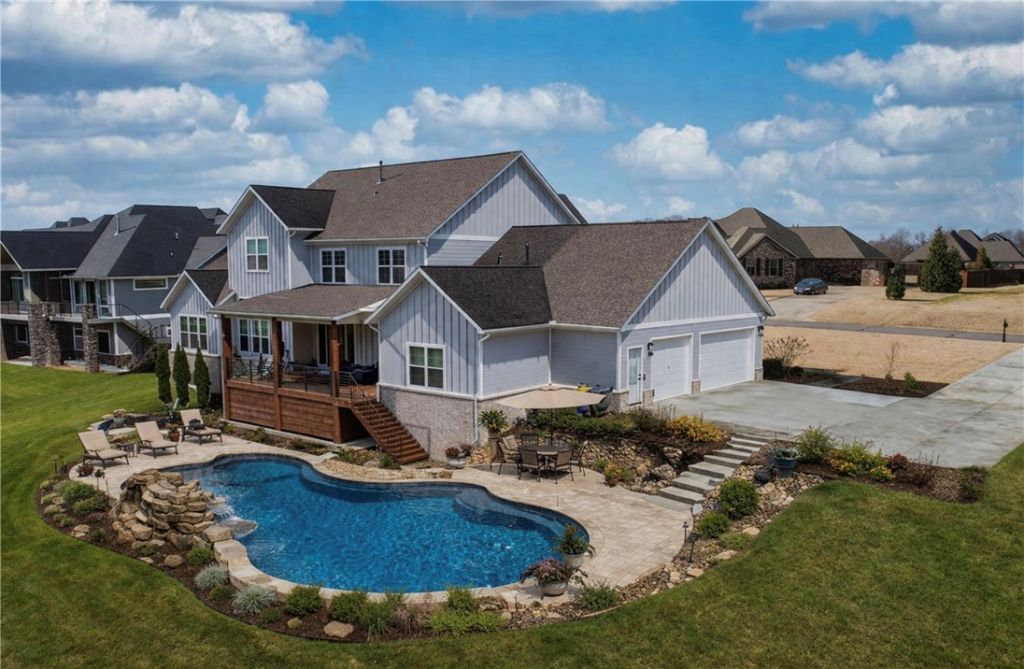 Beautiful 2022-built home on 1.28 acres in The Meadows at Little Flock. Offering approx. 4,608 sq ft, this 5-bedroom, 5-bath home features a flexible layout ideal for everyday living and entertaining. The main level includes a spacious primary suite plus an additional bedroom with private bath?perfect for guests or multigenerational living?along with a library/office, dining area, and inviting living room with fireplace. The kitchen offers granite countertops, custom cabinetry, pantry, and Energy Star appliances. Upstairs includes additional bedrooms and flexible spaces for recreation, fitness, or media. Enjoy outdoor living on the covered composite deck overlooking the landscaped yard with irrigation. 3-car garage. Located in Rogers School District with Bentonville School Choice options (buyer to verify). Some photos include AI-generated pool renderings; no pool currently exists.
