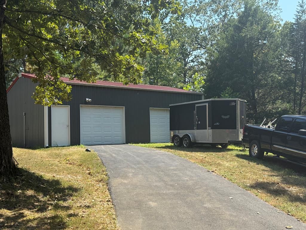 Single story 3 bedroom 2 bath home with spacious deck across front of home. Vaulted ceilings in living room and dining room. Stone gas log fireplace. Gas stove top in kitchen. Kitchen has tile flooring and tile backsplash with gas stove top and nice pantry. Attached 1 car garage w/ electric opener and 19.5x6.5 storage room and passage door. Additional lot has paved driveway leading to super nice detached 24x36 Metal building with passage door and 2 garage doors. Seller selling property as is.
