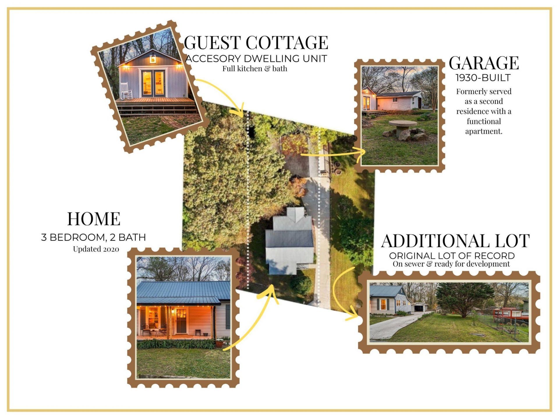 Three bedroom home (1,065 sq ft) and ADDITIONAL guest cottage with full, separate kitchen and bathroom (295 sq ft). Secluded and private on three lots, Pumpkin Pie Lane is tucked along a gentle creek with a stone backdrop at the foot of Lookout, this fully updated 1915 home preserves charm while offering contemporary comfort as you enjoy the walkability and community of St Elmo all while set apart from the noise.From the serene porch views of flowing creeks and peaceful woods, step inside the main house; you'll find three bedrooms, two full bathrooms, and an inviting open layout designed for connection and beauty. A thoughtful renovation in 2020 brought major electrical and plumbing upgrades, offering the charm of a historic home with the peace of mind of modern systems.As you step back outside, the magic continues. Spanning three original lots of record, this .43-acre parcel offers serenity, privacy, and endless potential. At nearly 300 sq ft, the guest cottage functions as the perfect setting for visitors, extended family, a home office, or a space that adapts to your life.An unmatched setting, your new home is just a short walk to the Hot Chocolatier, the Taco Truck, local shops, and trails that make St. Elmo Chattanooga's most vibrant and community-centered neighborhood.This listing includes lots 17, 18 and 19. The home and guest cottage sit on lots 18 & 19; with a rare opportunity, already separately platted and flat, Lot 17 is primed and ready for on-sewer development with comparable lots selling over $100K.