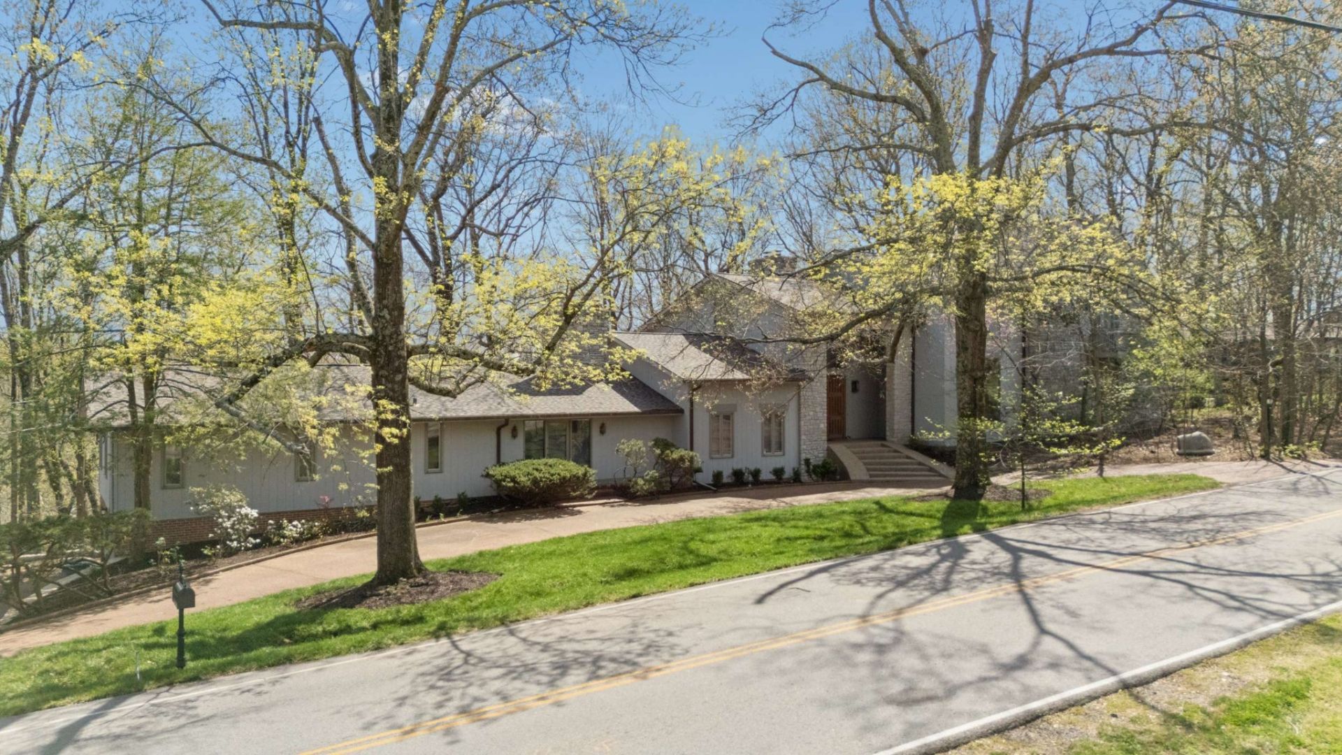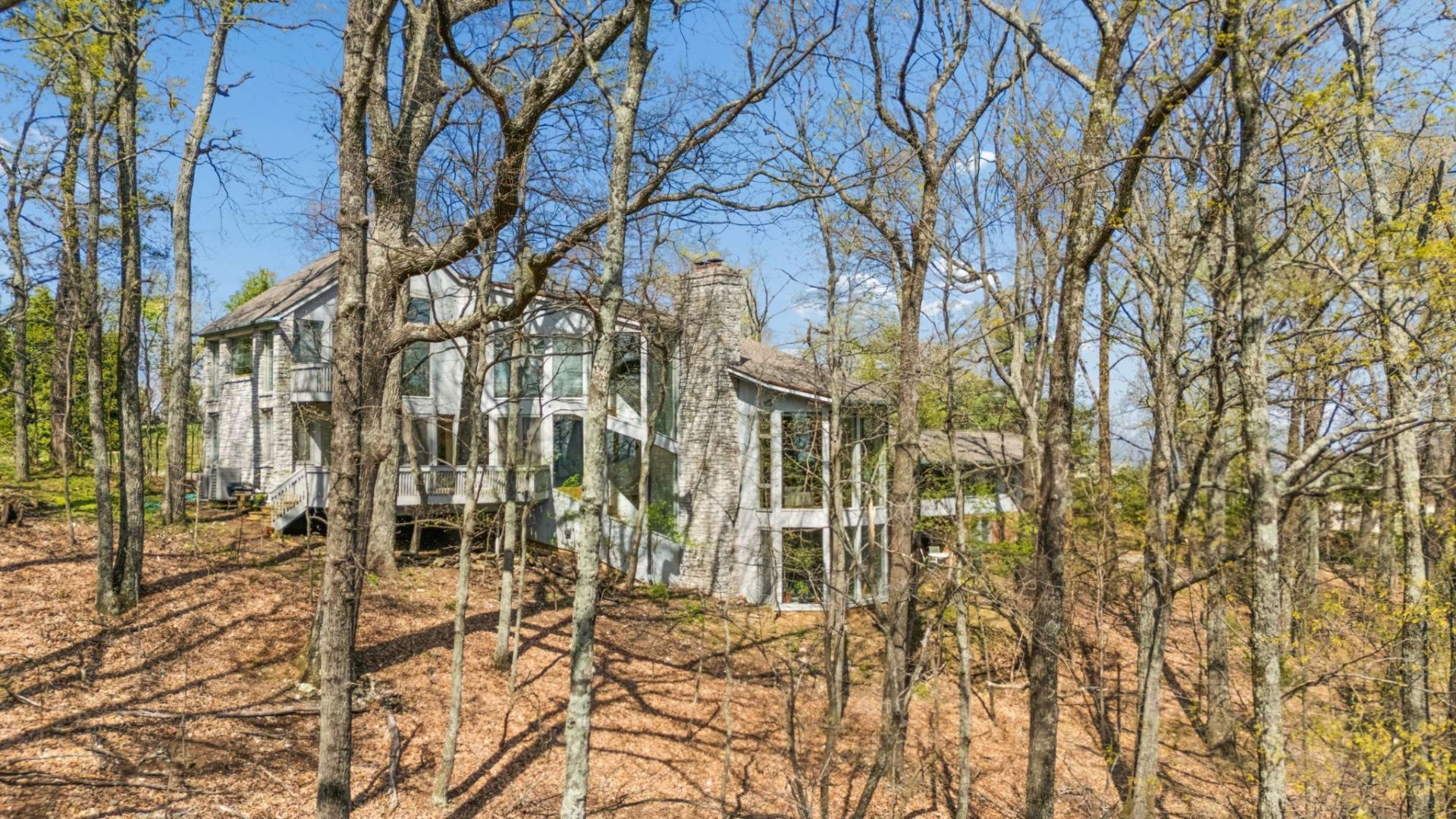 Nestled on Laurel Ridge on a cul-de-sac in a private neighborhood overlooking Nashville, this unique Robert Anderson stone and Eastern cedar dazzles visitors with a 21+ foot high entrance, three story spiral staircase, and spectacular views of forest, soaring birds, and larger Nashville, lit with warm sunrises and quiet sunsets, all viewed from majestic floor to ceiling windows. A sautillo tiled entry and 75 foot gallery hallway lead to stunning living spaces, featuring a paneled mahogany library and panoramic living room with concealed steel beams and a hand cut stone and limestone fireplace. With an elegant dining room, wet bar, butler's pantry, gourmet kitchen with floor to ceiling custom quarter cut white oak drawers and shelves, and built in art display cases designed by a museum conservator, it is an entertainer's and art lover's delight. Also built for practical living, the home possesses five large bedrooms, multiple private office areas with built-in walnut and chestnut desk and shelves, multiple mahogany doors, 4 fireplaces, hardwood floors, skylights, outdoor decks, a large laundry room with chutes, large art studio and game rooms, central vacuum, much storage, copper gutters, and southern exposures.