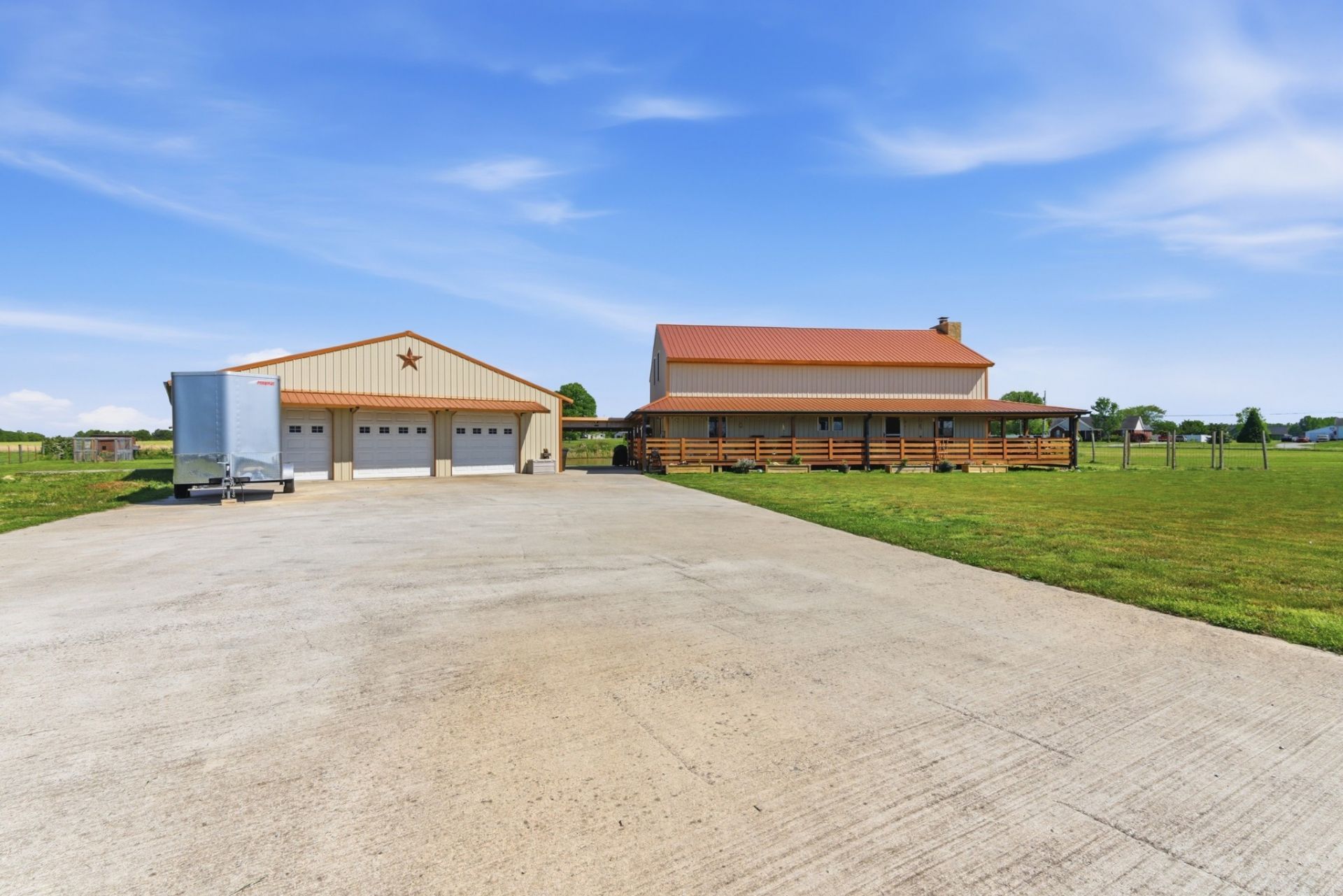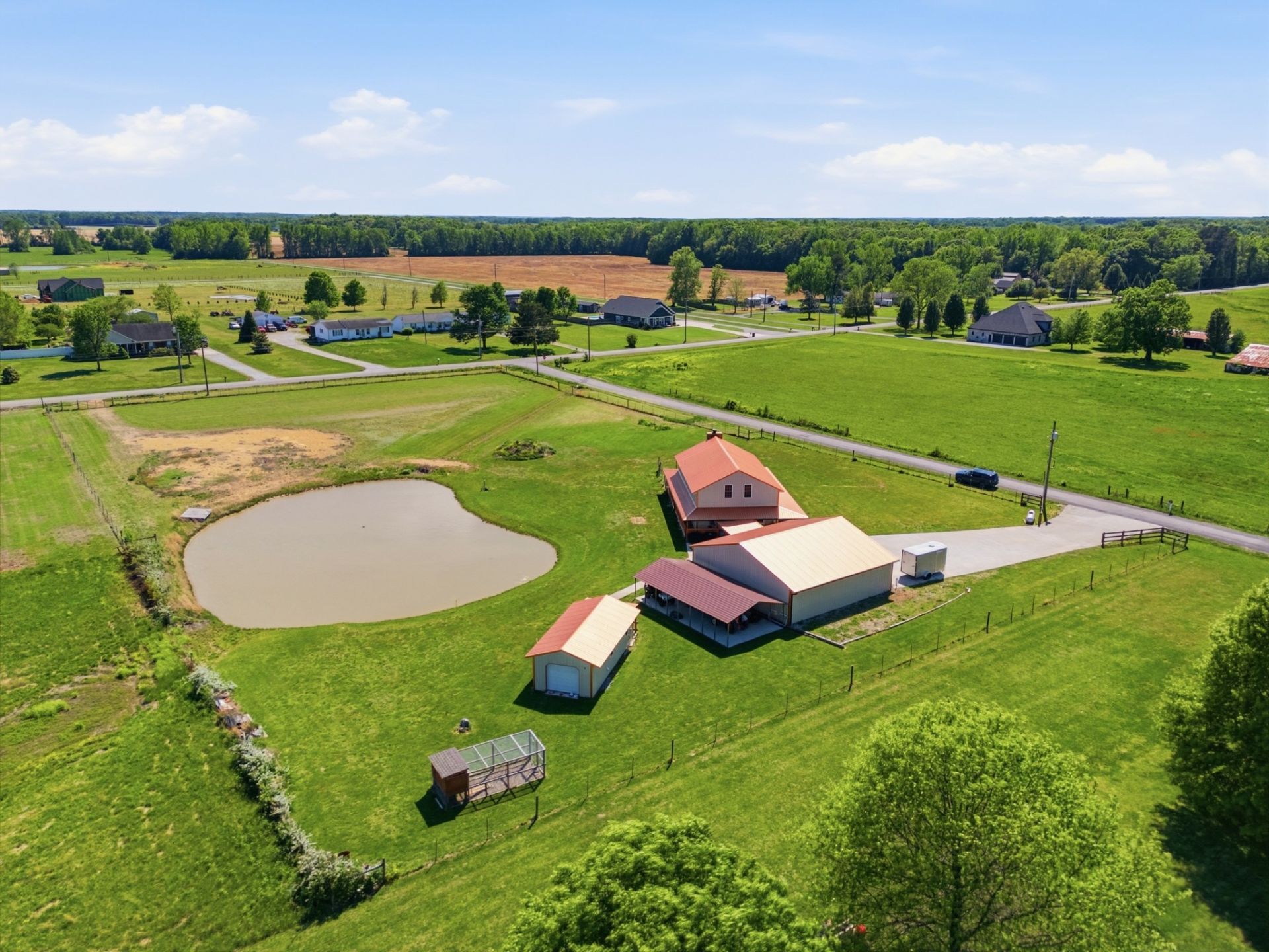 Showstopper custom build on 2.9 acres! This fully fenced property delivers privacy, versatility, and income potential with a detached ADU featuring full bath, full kitchen, and laundry-perfect for guests, rental, or multigenerational living. Inside the main home, enjoy an open-concept layout with soaring 20-ft ceilings, a dramatic wood-burning fireplace, and warm tongue-and-groove finishes throughout. Built for efficiency and ease with metal siding, spray foam insulation, and a fully encapsulated crawlspace. The 3-bay 40'x42' garage/workshop offers endless space for projects, storage, or toys. Relax by your stocked, aerated pond and take in the atmosphere.Just 25 minutes to Huntsville