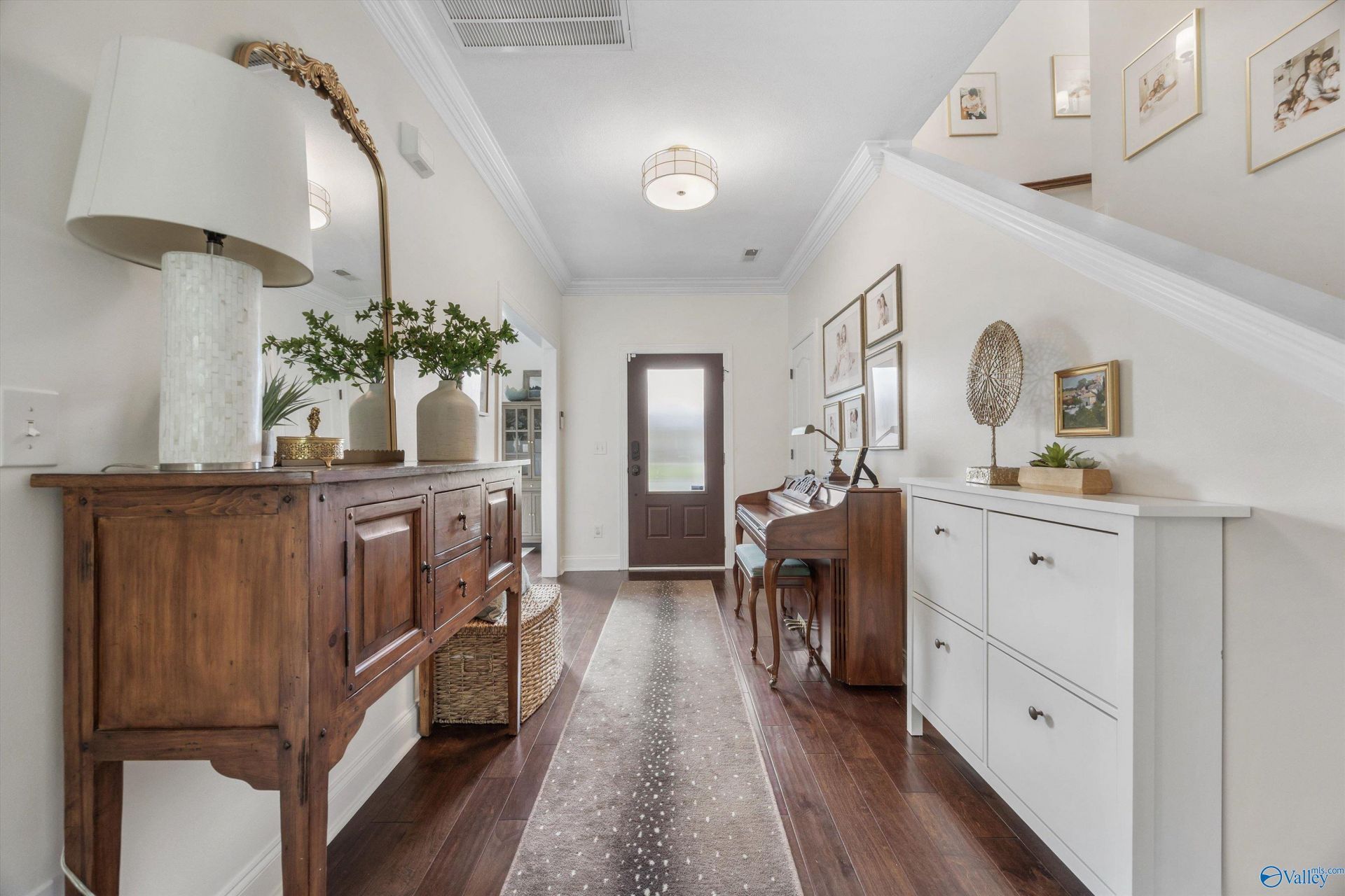Discover your dream home in Hampton Cove! This warm, inviting 5-bed gem boasts fresh paint, new HVACs, & gleaming hardwoods. Step through the new front door into an open floor plan w/ a main-level master suite featuring a walk-in closet, soaking tub, & separate shower. The kitchen, perfect for bar stools, overlooks a lush backyard. Upstairs, find 4 spacious bedrooms & a roomy playroom. Enjoy mountain views, a nearby creek, & an easy stroll to the Flint River. Cool off at the neighborhood pool & savor the convenience of restaurants & shopping just 5 minutes away. Don't miss this blend of comfort & charm!
