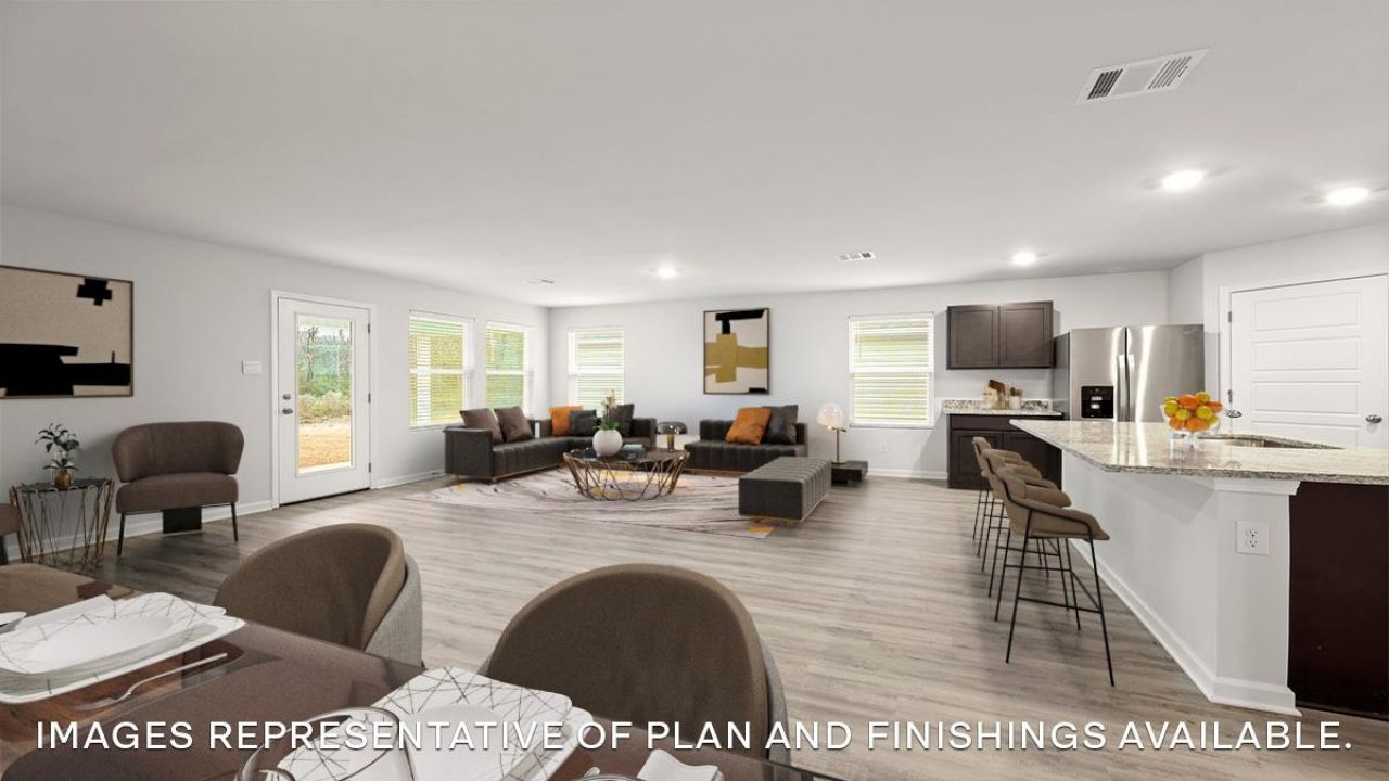 The appealing one-story home, The Spruce, includes many contemporary features, and an open-concept design, enhancing the wonderful feel of this home. The kitchen includes a large island perfect for bar-style eating or entertaining, a walk-in pantry, and plenty of cabinets and counter space. The Living room overlooks the covered porch, which is a great area for relaxing and dining al fresco. The large Bedroom One, located at the back of the home for privacy, includes an en suite bathroom with double vanity and a big walk-in closet. The two-car garage connects to the front hallway where the laundry room is located. Pictures, photographs, colors, features, and sizes are for illustration purposes only and will vary from the homes as built. Ask me about our National Red Tag Sale.